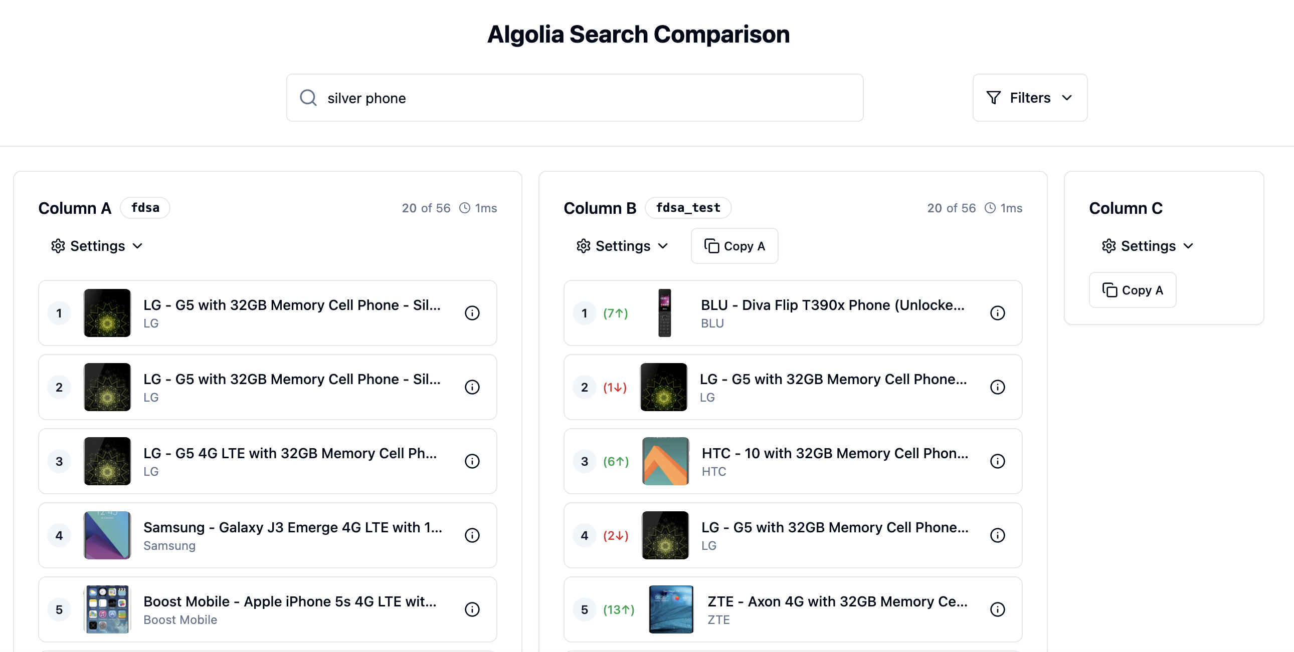 Algolia is a tremendously powerful search platform, especially for e-commerce. But like most SaaS tools, the management dashboard doesn't do everything you need it to do. In particular, it's hard to compare search result rankings across variations in indexes -- a super common pattern when you're testing and iterating on index configurations before A/B testing, implementing algorithm and UI proof-of-concepts, or refining search relevance.